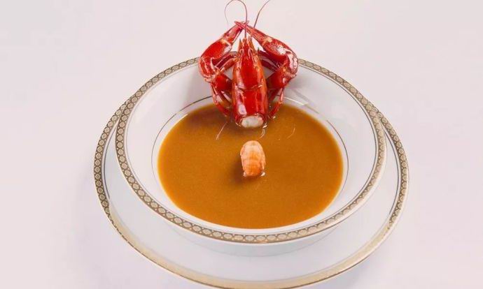 大家在左手边见到的是用日本国产小龙虾做的小龙虾汤。据说这个厨师在他的回忆录里面就讲了,为什么会做这个小龙虾汤呢,他以前在法国学艺,回到日本之后慢慢知道,北海道原来有一些原产的小龙虾,就做了这个汤。