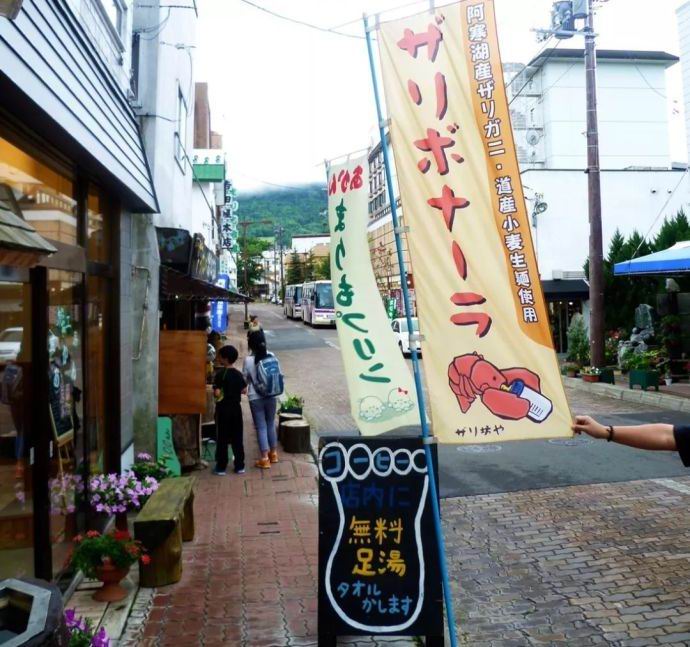 还有一个比较有趣的地方,阿寒湖是一个温泉地区,有一个小店主人以前是做甜品的,他回到阿寒湖之后就开了一间小店。这间小店一方面可以泡脚--因为有温泉嘛,另外你可以享受他做的小龙虾奶油面。