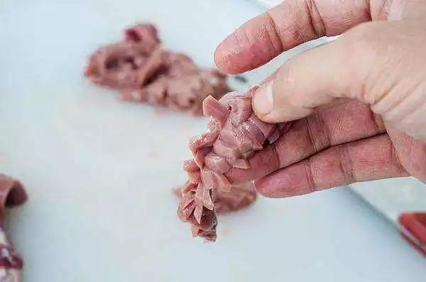 小清新派对于腰子的处理要求严格,鲜腰子切半之后要去除异味之源的骚腺。切腰花用斜刀,切完一侧再切另一侧,切完的腰花要断刀干净利索,隐约能看见刀痕而不断。当然你还可以使用中国烹饪的传统刀法核桃刀柳叶刀,考验的是刀工,但作用只有一个,让之后的腌制更加入味。