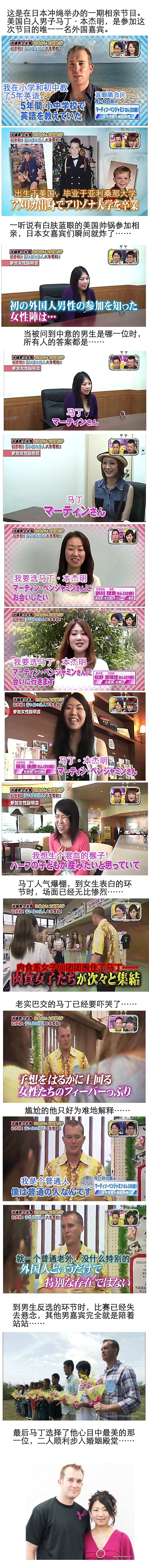 其实不只中国,在已成发达国家的日本,恋爱中“崇洋媚外”的现象依然存在,女孩子们都幻想嫁个金发碧眼的老外,生个混血娃。看看这期岛国相亲节目你就知道,一旦白人出马,日本男人完全就是配角,画面惨到不敢看……当然,想战胜所有妹子抢到老外,也需要特别的外貌优势