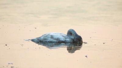 小天鹅一动不动浮在水面,这样呆呆地静止了好久。之后,小天鹅突然开始将头埋在水里,水面上泛起嘟嘟水泡。
