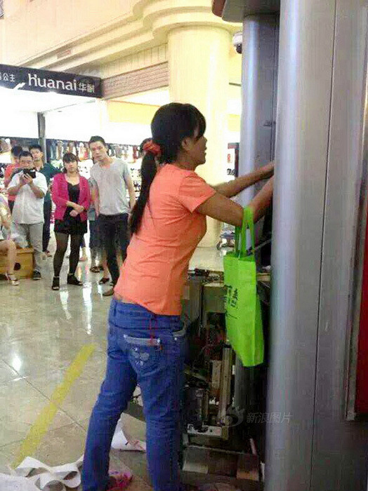 近日,一则《东莞“女侠”为取被吞银行卡,竟将银行柜员机拆了!》的帖子在网上疯传。10月16日,广东东莞石龙镇金沙购物广场内,一名女子因银行卡被吞,硬生生将一台柜员机拆毁了。图为女子正在商场内拆ATM机。