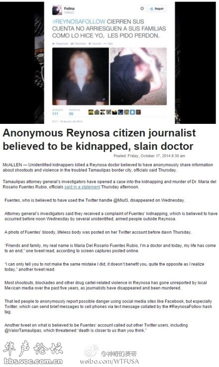 墨西哥一名经常在推特上提醒民众小心黑帮枪战火并的民间记者,在周三被持枪歹徒绑架带走,然后其推特账号上传了她尸体的照片并设置为头像,附上“今天我的生命到此为止”、“我只能让你们不要犯我犯下的错误,对你没好处,我也是今天才发现”等消息……