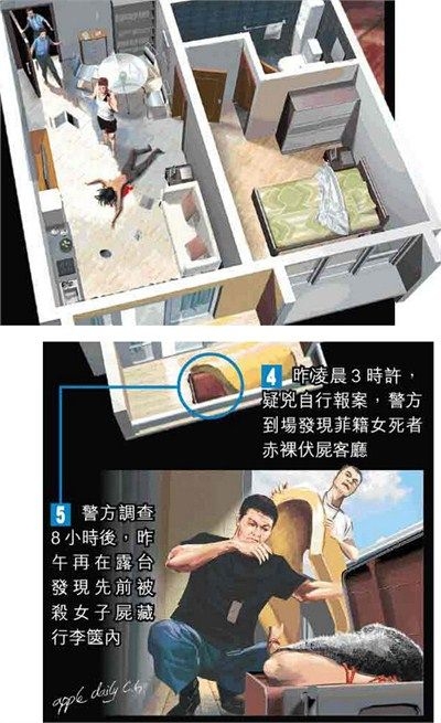 案中首先被发现的受害人30岁,为菲律宾籍,她全身赤裸被置于客厅,面部血肉模糊,喉咙被割破,后颈及臀部有多处刀扎伤痕;第二名被发现的受害人25岁,印尼籍。发现时,其身体被塞进一米长、半米宽、半米高的橙啡色李箱内,全身赤裸被人用粗尼龙绳捆绑,并用床单包裹上身,露出脚踝。