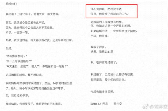 苍老师说,自己已经出道十五年了,想结婚,想要家庭,想要孩子。虽然老公没钱,也不帅,但他接受了自己以前的工作。