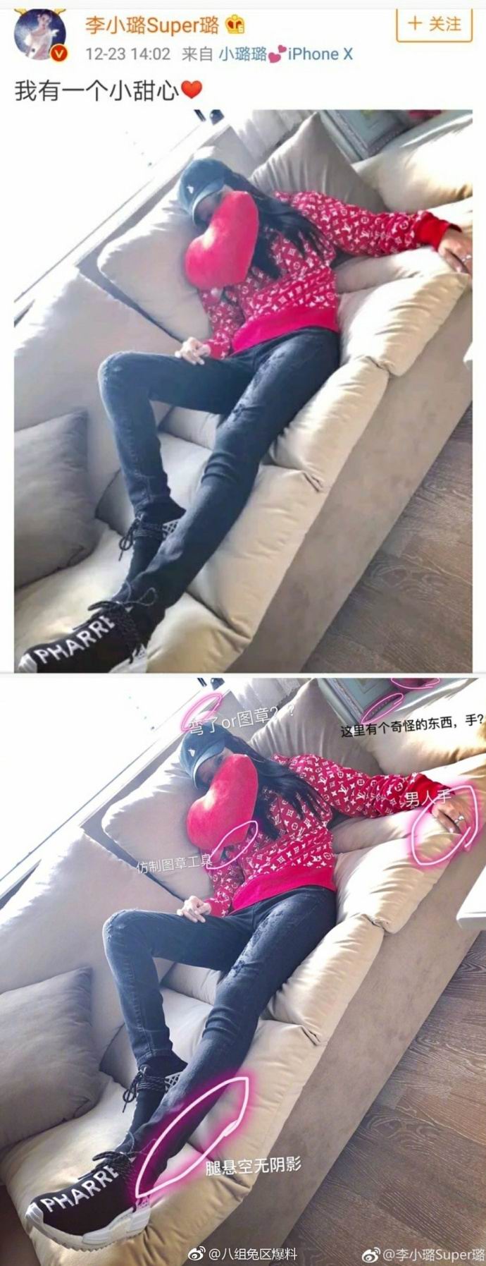 2,李小璐12月23日发出的微博配图,好像很也不简单,疑似是她和PG.One的亲密照片,只是P掉了PG.One的部分。