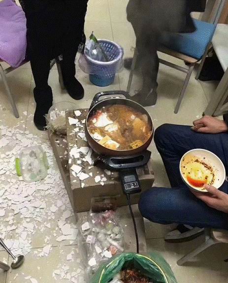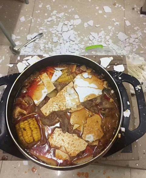昨天,她刚做好的火锅,刚吃了两口,突然!!房顶上就掉下来一大块墙皮……墙皮……