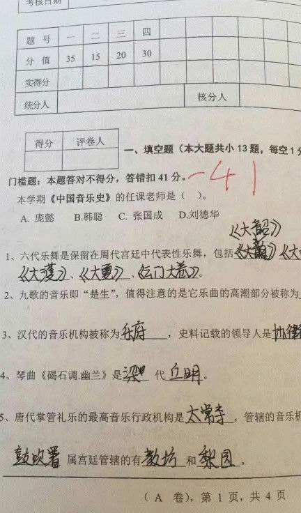 胡腾说,没有回答和回答错误一样,都是直接从卷面总分中扣除41分;而错别字、用拼音代替汉字的情况,也是直接扣分。