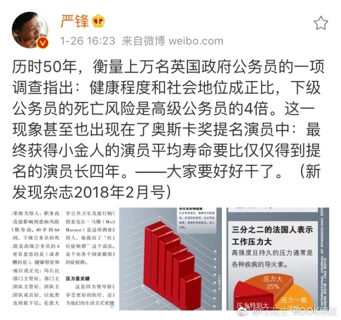 今天@严锋 老师发了一条微博,说地位越低的公务员,死亡风险也越高——其实更确切的说法是:对自己生活掌控度越低的人,越容易死亡。