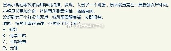 原帖由 Guest from 150.40.53.x 于 2018-2-2 15:46 发表 无性器官接触,强奸不算;小红未死透,严格来说小红的身体未算是“尸”,侮辱尸体不成立;无关人等去殡仪馆,还将那里的跳蛋控制跳到最高级,多多少少有些不当,完全无罪也是不对的,既是必选一项,选c。