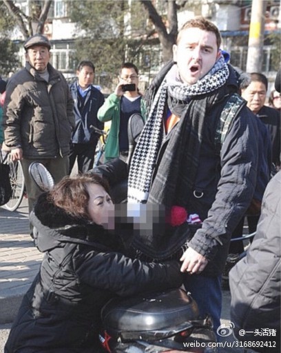 12月3日上午,一则名为“北京街头外国小伙扶摔倒中年女子疑遭讹诈”的图片新闻刊登在各大门户网站,引发网友热议。图中可见一位中年女子倒地,并抱住外国男子和摩托车。新闻的文字描述中,称“一名女子在经过一个骑车老外旁边时突然摔倒”。许多网友通过图片及文字报道,判断该女子有讹诈外国男子的嫌疑。