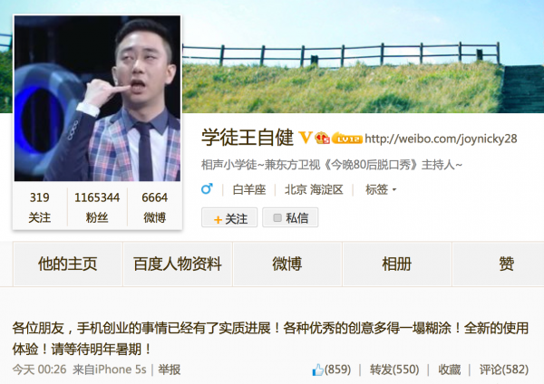今天凌晨,相声演员王自健在微博上宣布正式进军手机行业,引发了轩然大波。王自健在微博上表示“各位朋友,手机创业的事情已经有了实质进展!各种优秀的创意多得一塌糊涂!全新的使用体验!请等待明年暑期!”在这条微博发出之后,王自健备受吐槽,有不少网友都恳请他放过可怜的“手机圈”。