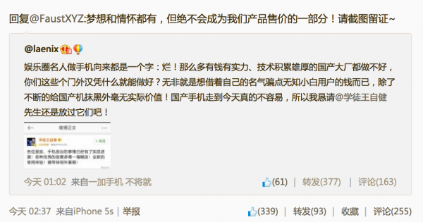 对此,王自健回应称他做的手机绝对不会是贴牌玩票性质,也绝对不会给国产手机抹黑,否则他“干一斤翔”。