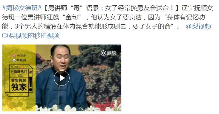最近,网上热传一个视频,说的辽宁抚顺女德班一位男讲师狂飙"金句",他认为女子要贞洁,因为"身体有记忆功能,3个男人的精液在体内混合就能形成剧毒,要了女子的命"。