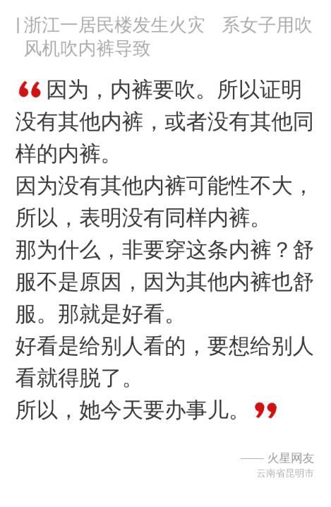 原来,杭州一幢居民楼近日发生火灾,起因正是当中一名女住户用吹风机吹内裤时,吹了一半就去洗澡了,把开着的电吹风放在了衣服当中捂着,过热引发了火灾。