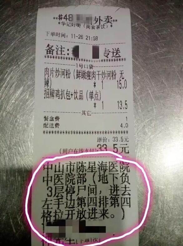 广东中山的朋友圈最近被一张外卖单刷爆了。外卖地址竟然是医院的太平间,是要求送去医院停尸间左起第四排第四格拉开放下。。。
