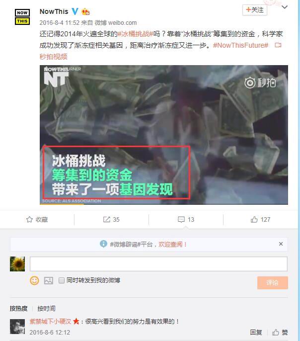 "冰桶挑战"确实很具有划时代的意义,它应该是在新媒体时代里,首次以欢乐的方式传播一件严肃的事并最终成功的案例。而且,冰桶挑战所酬得的善款,赞助研究"渐冻症"治疗方法,也是取得了重大的突破。