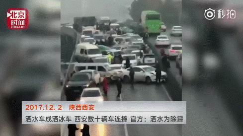 12月2日,陕西西安,西二环高架桥上,发生连环追尾,30多辆车连撞,2人受伤……交警部门称系市政洒水路面结冰,引发车祸。