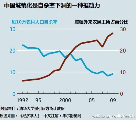 【中国新城镇化的另一贡献:拉低自杀率?】过去十年中国自杀率降约一半,35岁以下农村女性自杀率减少90%。《经济学人》总结了两大原因,其中之一是:农村人进城,年轻农村女性摆脱父母和婆婆的压力,婚姻失败的打击和其他贫困影响有所减少。城里买到自杀的农药也不那么容易。
