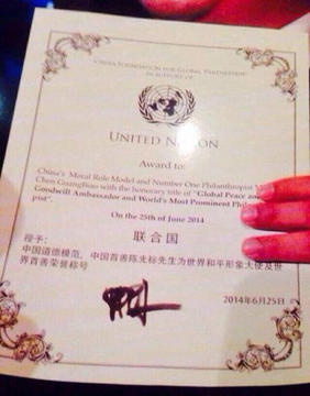 “我现在是‘世界首善’了。”陈光标回国后接受澎湃新闻网专访时再三强调,这是联合国组织颁予他的称号。而澎湃新闻网则表示,实际上,该基金会并非联合国官方机构。那么,所谓的中国全球合作基金会(以下简称CFGP)究竟是个什么样的组织,与联合国又有什么关系呢?