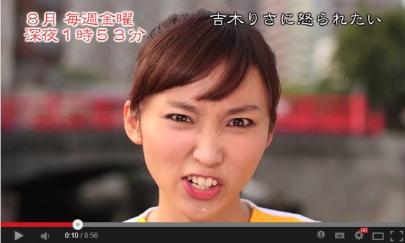 据了解,日本东京电视台针对30多岁的男性观众,新推出一档名为《我想要吉木莉莎(Risa Yoshiki)生我的气》的节目。此节目每周五凌晨1点53分播出,节目时长仅有5分钟。担纲出演该节目的女演员是27岁的吉木莉莎。她原本是日本当红写真女星,专门拍摄全裸、半裸等极具诱惑的写真集。但在此节目中,吉木莉莎的穿着相对保守,但在言辞上却犀利很多。