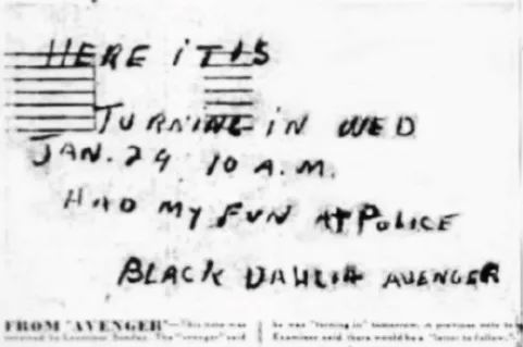 1.月.28.日,警局收到了第二封,这是一封手写信件,信件内容是:「周三,1.月.29.日,10.点是转折点,我要在警察那里寻开心」,落款:「黑色大丽花复仇者」。