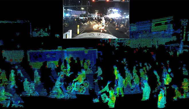 因为光速已知,算法可以通过回波的时延计算出车辆与障碍物的距离。激光不断扫描,就得到一幅点云,点云图中的每个点包含 XYZ 坐标、反射强度等信息,从而实现 3D 成像。