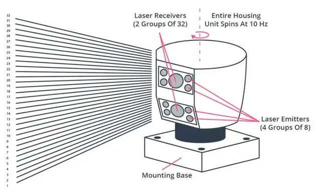 以 Velodyne 32 线激光雷达 HDL-32E 为例,保温杯大小的体积里需要集成 32 束激光发射器和 32 个接收器。如果要提高感知能力,就要增加收发器,但体积也会随之扩大,成本水涨船高。