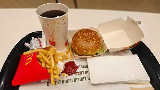 麦当劳 Big Mac 套餐,48 谢克尔(96 人民币)。美式连锁在以色列是最廉价的食物,也是少数在安息日营业的餐厅。