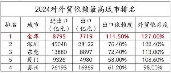 2024 年,金华的进出口总额为 8795 亿元,而出口总额就达 7719 亿元,其出口依赖度和外贸依存度,都高于 100%,比深圳还高