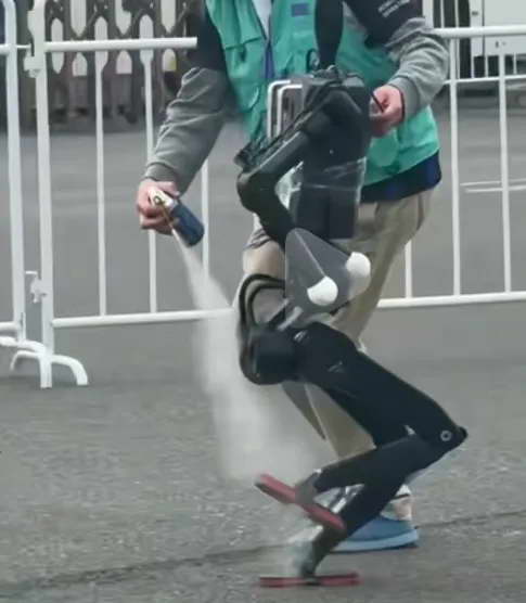 再就是很多机器人动作不协调,基本平衡能力都有问题,有个机器人跑着跑着就摔倒了,头都都摔掉了。
