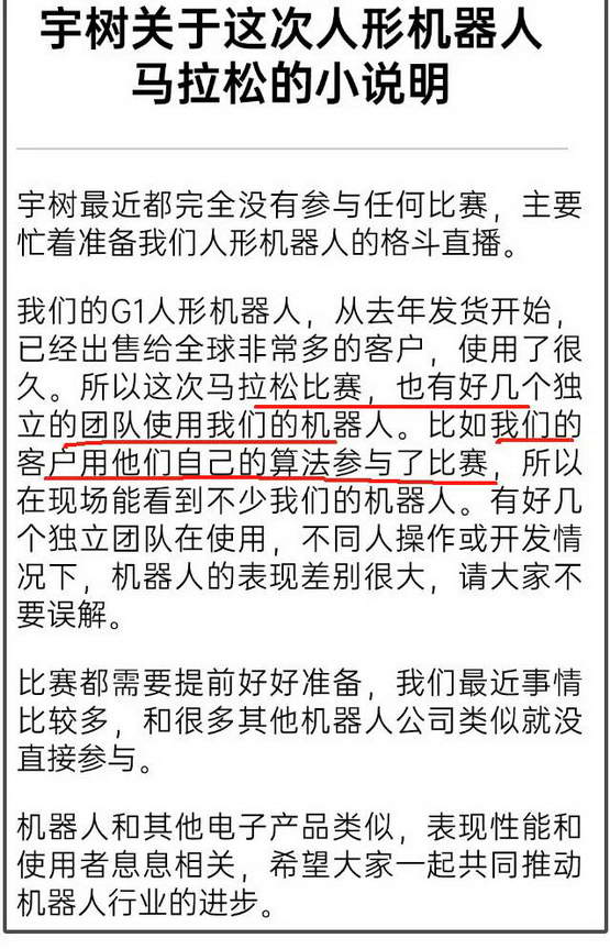 事后宇树机器人发文澄清,说是客户买了自己的产品去参赛的,算法是客户自己弄的,并非宇树官方的算法。