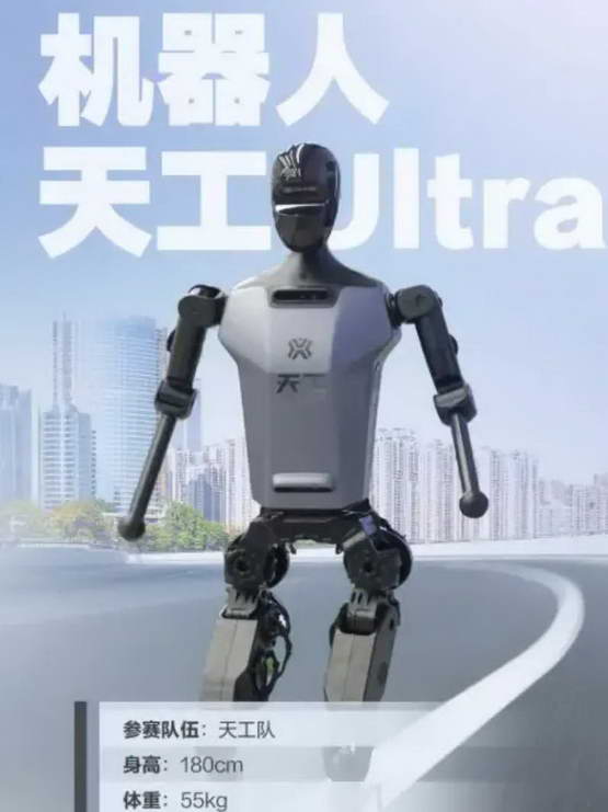 第一是天工机器人,中途没有更换机器人,用时 2 小时 40 分。身高 1.8 米,和人类身材最相近。