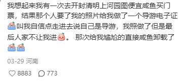 先是有个河南 IP 的网友 A 痛心疾首,说自己有一次图便宜,在闲鱼上买了开封清明上河园门票,店家给他做了一个导游电子证,叫他自信点走进去,结果被拒绝入内后,他尴尬的直接卸载了闲鱼。