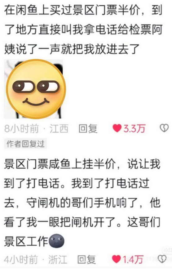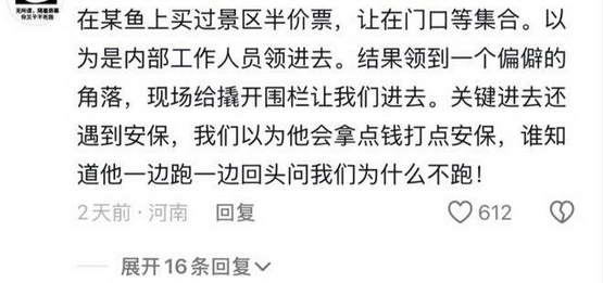 更有个网友 C 哭笑不得地分享自己在某鱼上买过景区半价票,店家领他到一个偏僻角落,现场给撬开围栏让他们进去,遇到保安后,这个网友以为店家会拿点钱打点安保,谁知道他一边跑一边回头问他们为什么不跑?