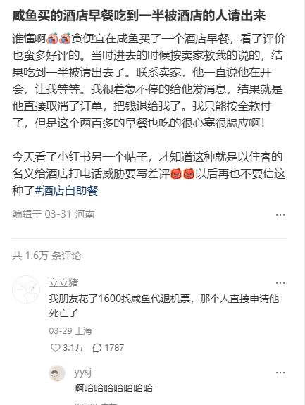其实倒也不仅是门票,作为一个五花八门的平台,有网友吐槽自己在闲鱼买了某五星酒店的早餐券,刚吃一半就被服务员 “请出去”,原因是卖家假冒住客身份打电话威胁酒店,“不提供早餐就要差评”,被识破后列入黑名单,吃到嘴里的火腿都得吐出来。