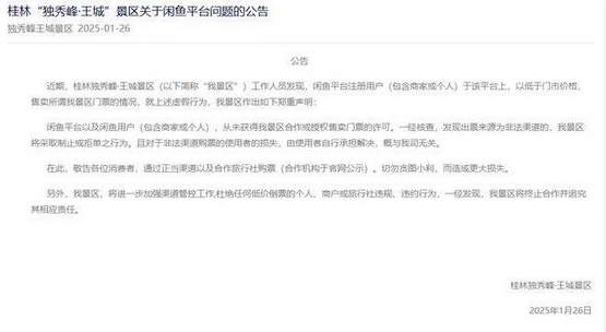 今年 1 月,桂林独秀峰?王城景区发布官方公告称,“近期,工作人员发现闲鱼平台注册用户(包含商家或个人)于该平台上,以低于门市价格,售卖所谓我景区门票的情况,对于非法渠道购票的使用者的损失,由使用者自行承担解决,概与我司无关。”