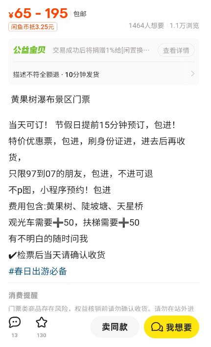 咱们先说贵州著名 5A 景区黄果树瀑布,我看到好几家闲鱼上卖门票的店家写着 “不 P 图”、“小程序预约”、“包进”,但确实也就正常景区门票 1/4 价格的商家,聊上之后,店家神神秘秘地让我先付款,“其他的等会一步一步教你买”。
