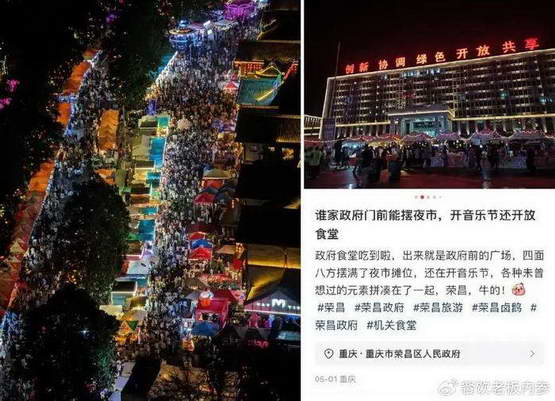 五一爆火的荣昌,当地的小贩也赢麻了。根据媒体的报道,全城的卤鸭摊都供不应求,离开荣昌的游客,几乎人手一只卤鸭。荣昌区委书记高书记说,欢迎大家来荣昌这座千年古城,交警不会来贴单,城管不会来掀摊。