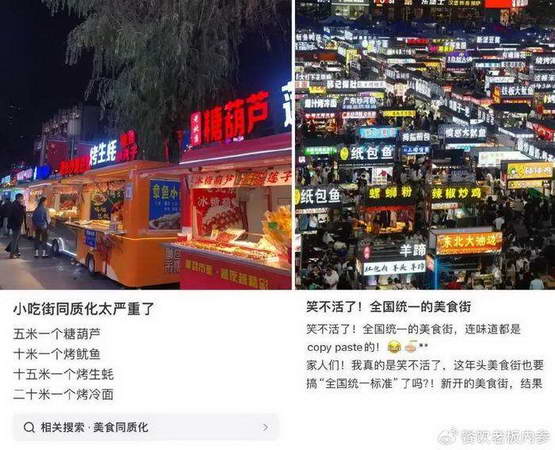有网友调侃,以前夜市几乎人手一份 “摆摊三件套”:烤肠、臭豆腐、奶茶。后来风格 “洋气” 了,又变成甜品、炸薯条和热狗。但无论怎么变,都是一个模子刻出来的,缺乏创意和差异化。