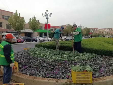 园林工人在绿化带里清理羽衣甘蓝,威海,2023 年