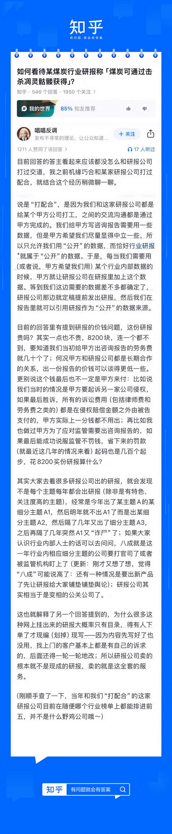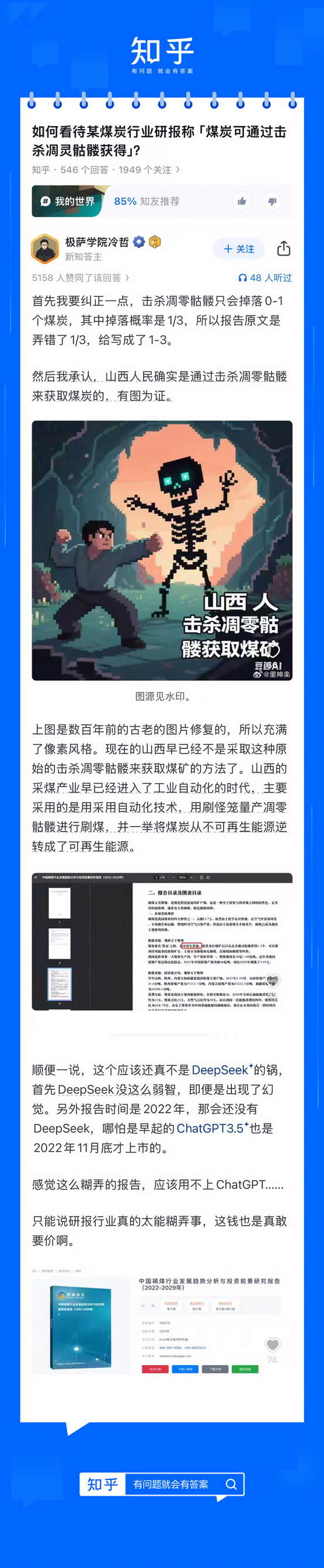 @知乎:当你以为自己把事情搞砸了的时候,不妨看看这份售价 7600 块钱的行业研报:某煤炭行业研报称「煤炭可通过击杀凋灵骷髅获得」……