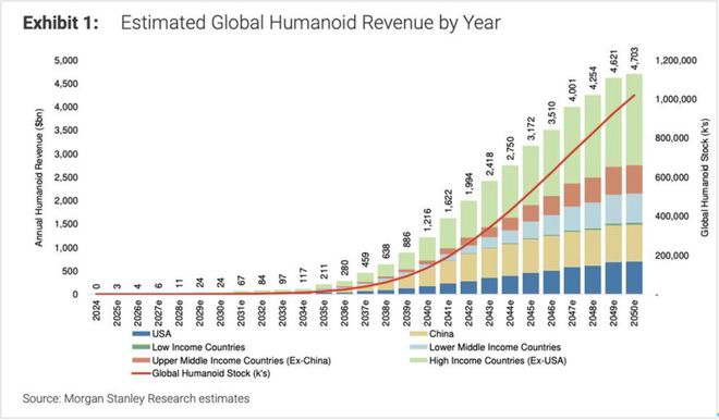 但按照大摩预测,人形机器人达到 10 亿台的市场规模,要等到 2050 年。凯恩斯那句 “长远来看我们都死了”,含金量还在提高。