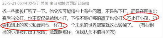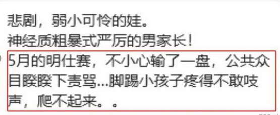 这次出事前也一样。因为最后一盘输了没能夺冠,家长当众把孩子踹飞了。