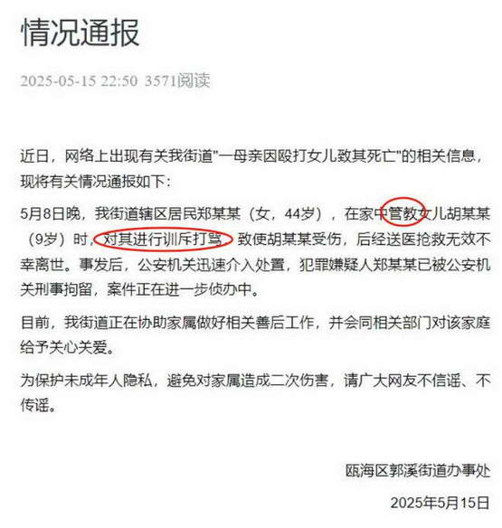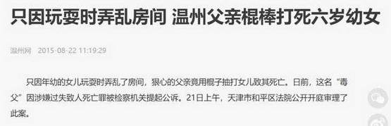 一个星期前的温州,也有母亲 “管教” 女儿后,导致 9 岁女儿受伤致死。