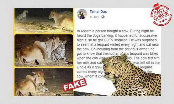 这个事件拍下的照片,在 2020 年冠以 “印度阿萨姆一只小豹子被母牛养大,还不忘了回来看望自己的妈妈” 的文案传播,但这个听起来更 “可信” 的版本其实是假的。