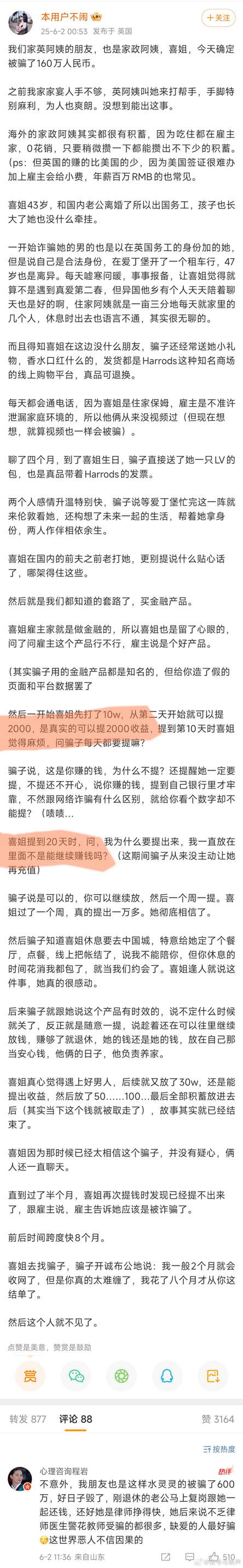 这里面有个 “细节坑” 很有意思:存 10w,每天赚 2000,每天都可以提出来。看起来是 “赚” 的钱,其实还是自己 10w 本金里面的,提了 20 天才提了 4w,也都是自己本金里面的。还被骗子捏着 6w