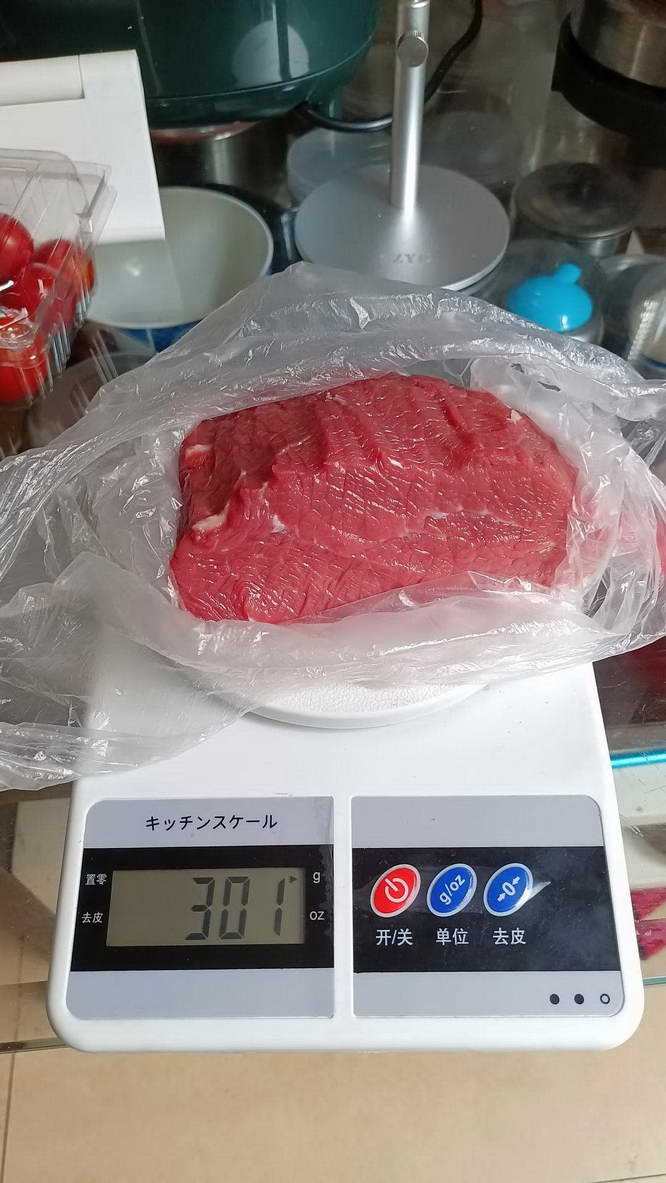 准备了 300 克的牛里脊,最好买新鲜牛肉,不要用冷冻的,买的时候叫卖主把筋膜给剃了。我这里 300 克的牛肉,做出来的成品是 150 克,一锅刚好够烤。