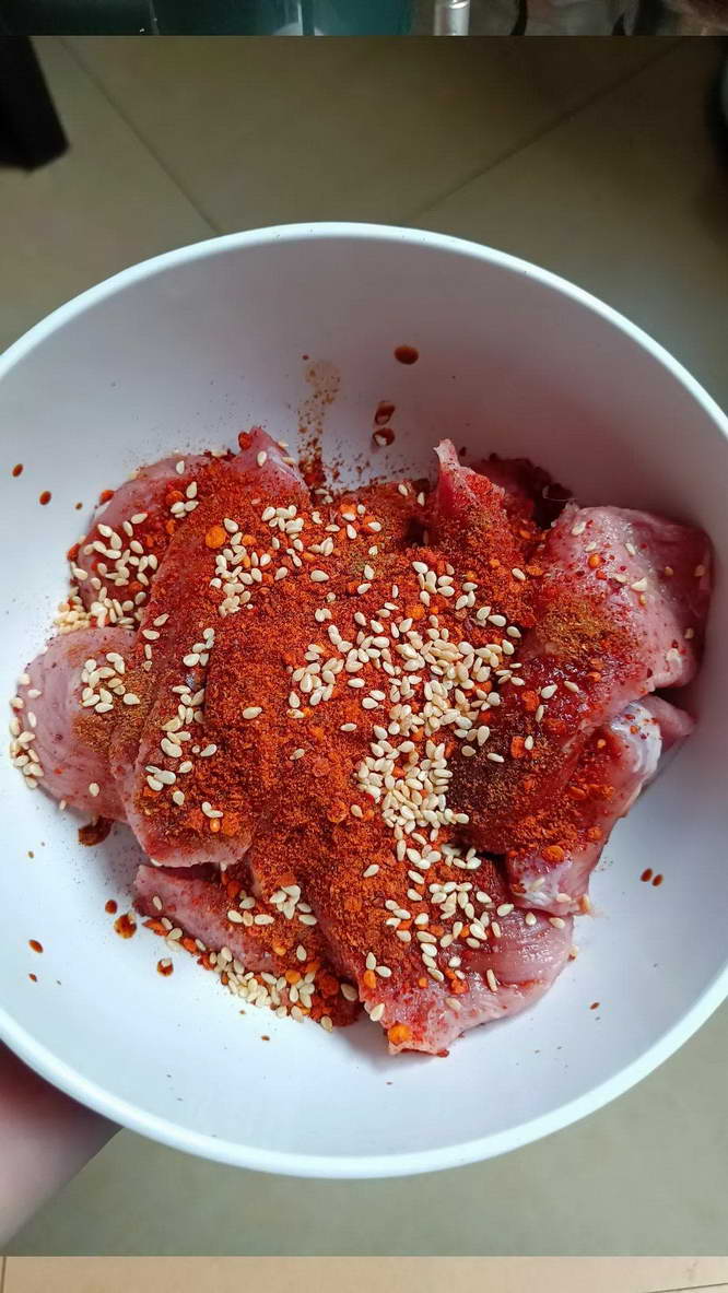牛肉切成手指头一样粗(注意要顺丝切!不然成品就不会拉丝),冷水泡 20 分钟泡出血水,加入:蚝油、生抽、烧烤料、白芝麻、白糖或蜂蜜、孜然粉、五香粉、花椒粉抓拌均匀,腌制 2 小时。大家可以根据自己喜好放入调料:因为我喜欢吃辣,就多放了点辣椒。