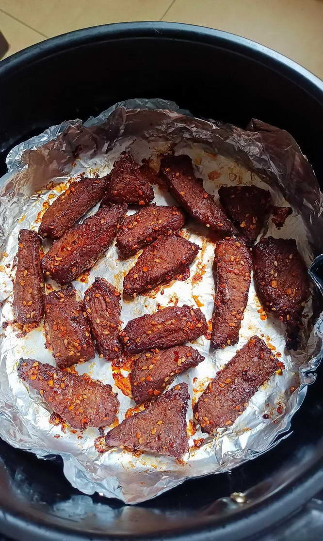 把腌制好的牛肉放入锅里,200 度先烤 10 分钟,然后这时候你会看到烤出来一些水,把那些水倒掉或擦干,然后再翻面烤 10 分钟就可以吃了,如果喜欢吃干一点的还可以再烤 5 分钟。
